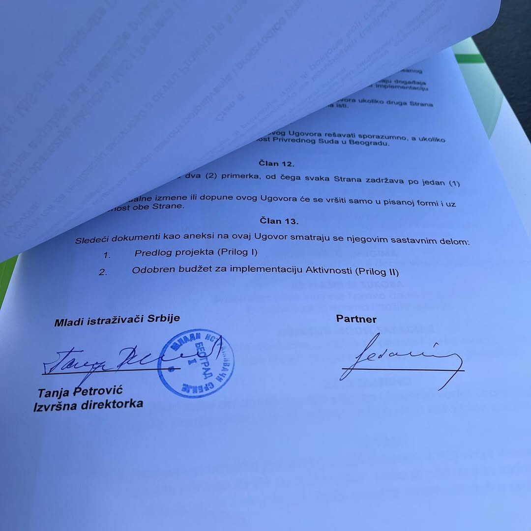 U prostorijama Mladi istraživači Srbije potpisuje se ugovor o realizaciji projekta „Vratimo mladicu u Grabovicu“, koji sprovodi neformalna grupa ECOchangers, uz finansijsku podršku Evropska unija u saradnji sa partnerskim organizacijama.